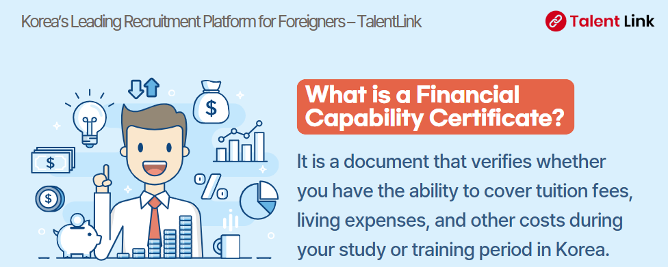 The Financial Capability Certificate is a document that verifies whether an international student has sufficient funds to cover tuition, living expenses, and housing costs while studying or training in Korea. Without adequate financial ability, there is a high risk of dropping out, illegal employment, or overstaying. Therefore, it is a mandatory document when applying for a student visa.