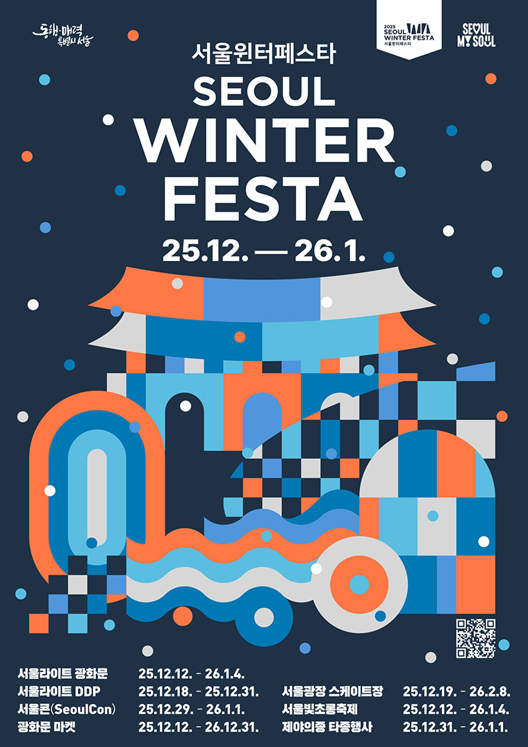 서울시가 12월 12일부터 2026년 1월 4일까지 24일간, 광화문광장~청계천~서울광장~DDP~보신각~우이천 6곳을 잇는 초대형 겨울축제 ‘2025 서울윈터페스타’를 개최합니다.