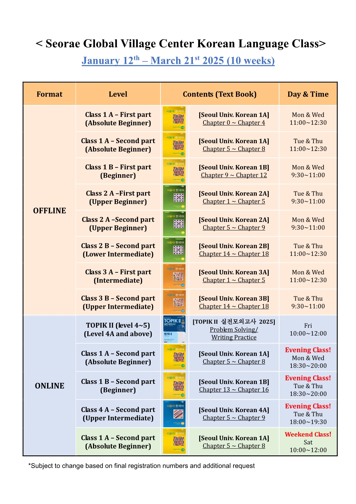 아래의 링크를 클릭하여 시간표와 교재, 신청서 제출방법 등 상세 정보를 확인하여 주시기 바랍니다: