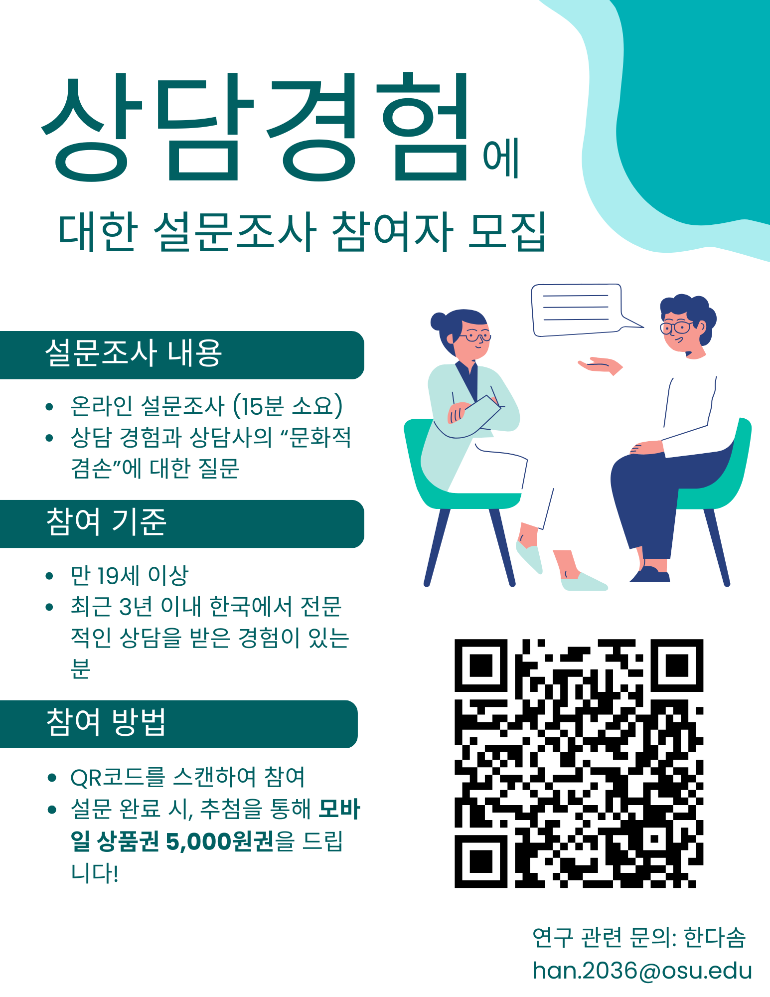 [추첨을 통한 기프티콘 제공] 상담 경험 있으신가요? 상담사의 “문화적 겸손”에 대한 짧은 설문에 참여해 주세요!